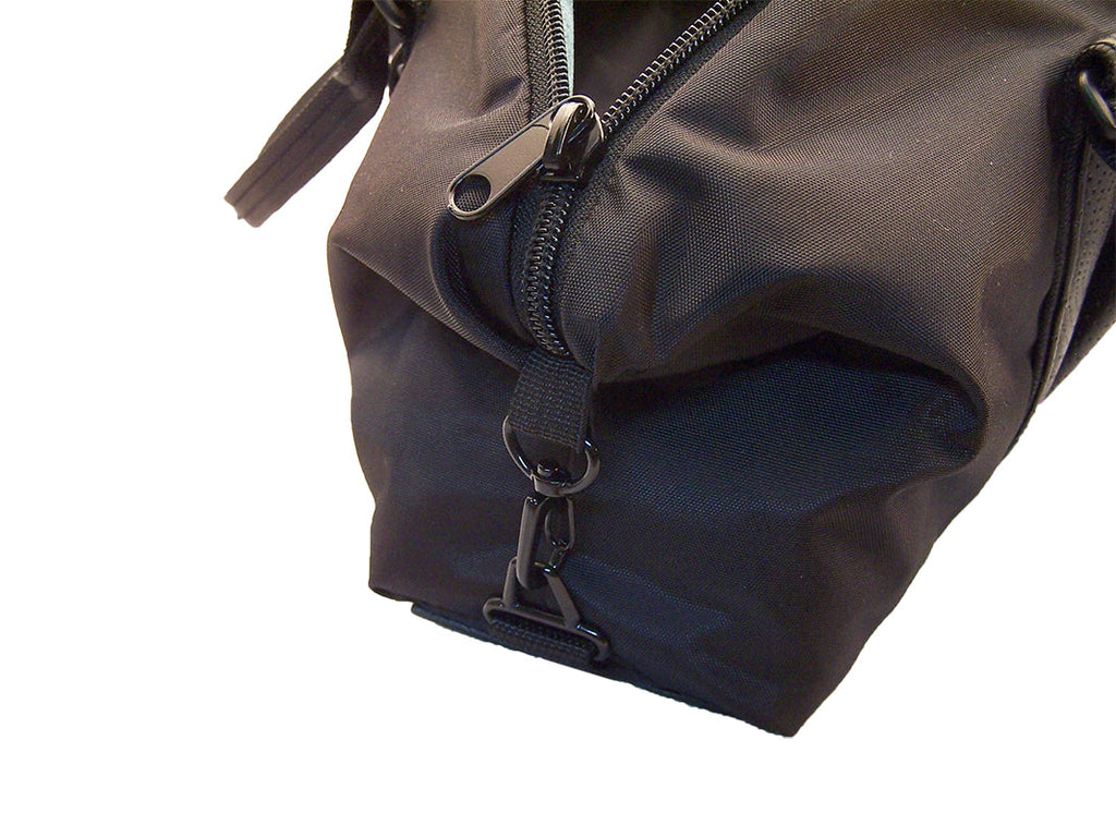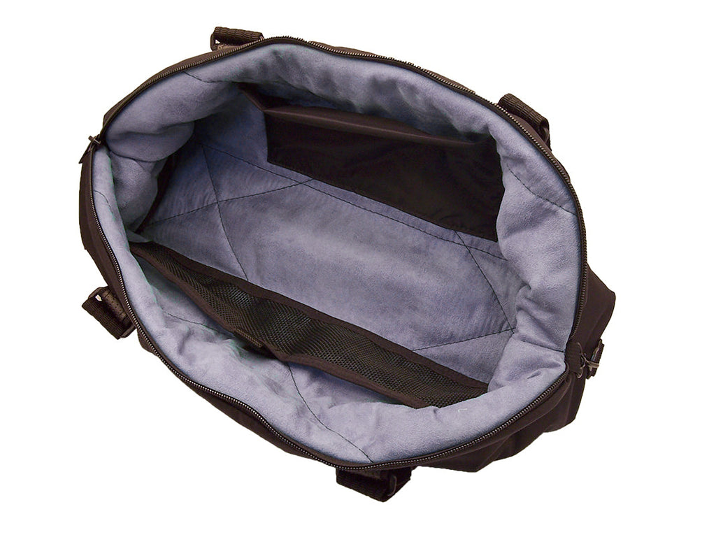 This variation has a water resistant, 420 denier black nylon packcloth exterior, patterned black vinyl pockets, and your color choice of quilted faux suede lining.